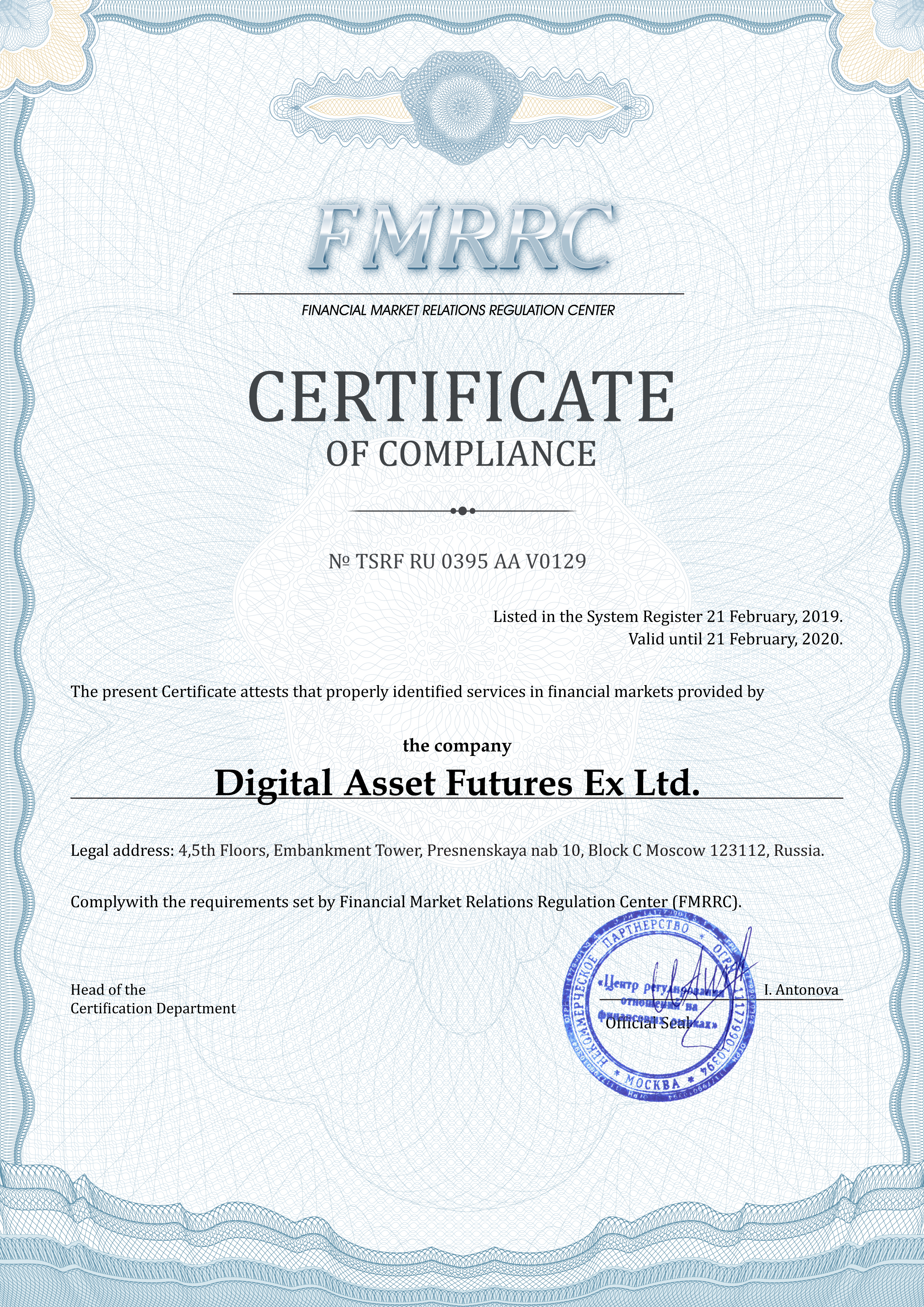 Digital Asset Futures Ex Ltd. company Certificate of compliance