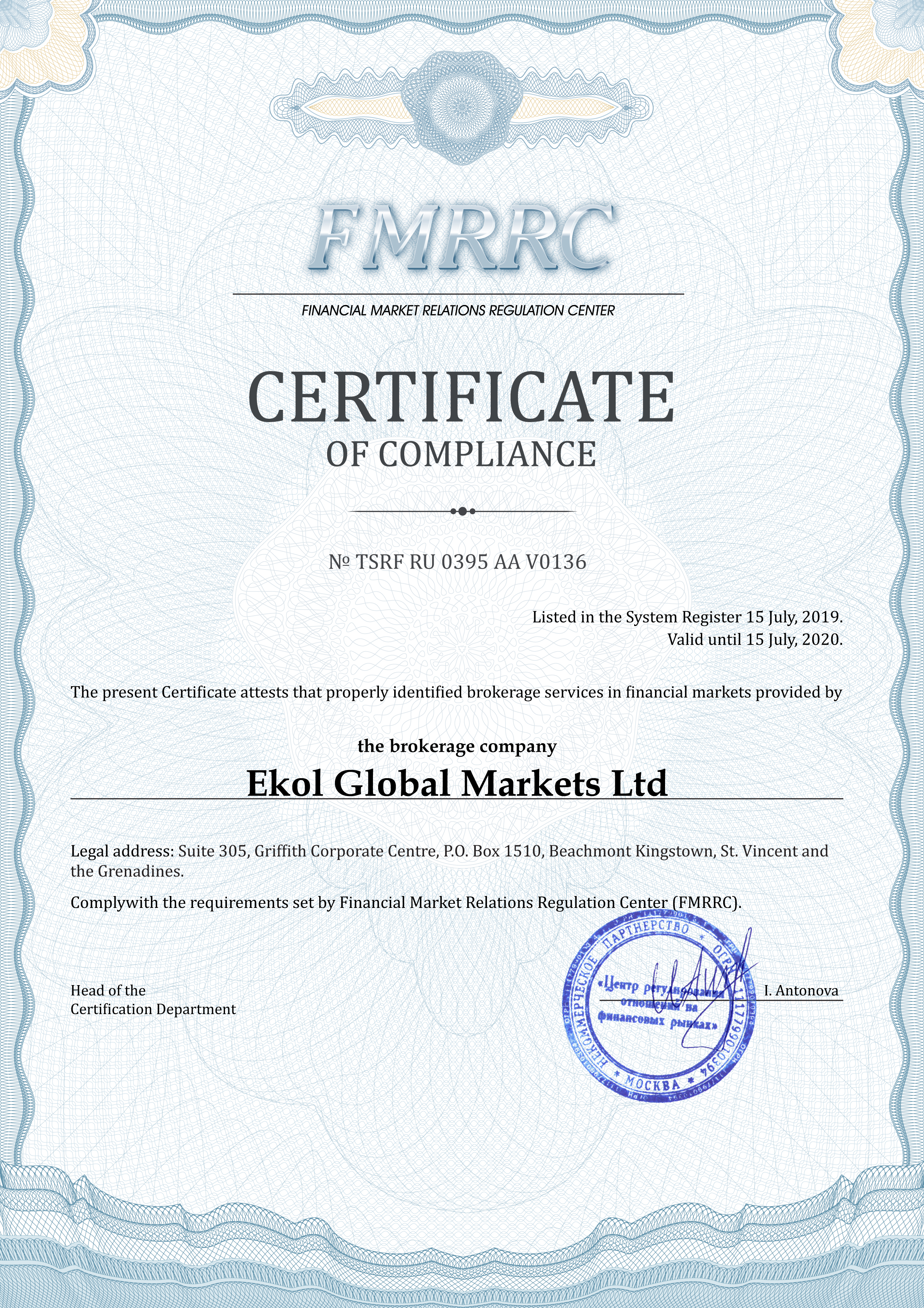 Ekol Global Markets Ltd company Certificate of compliance