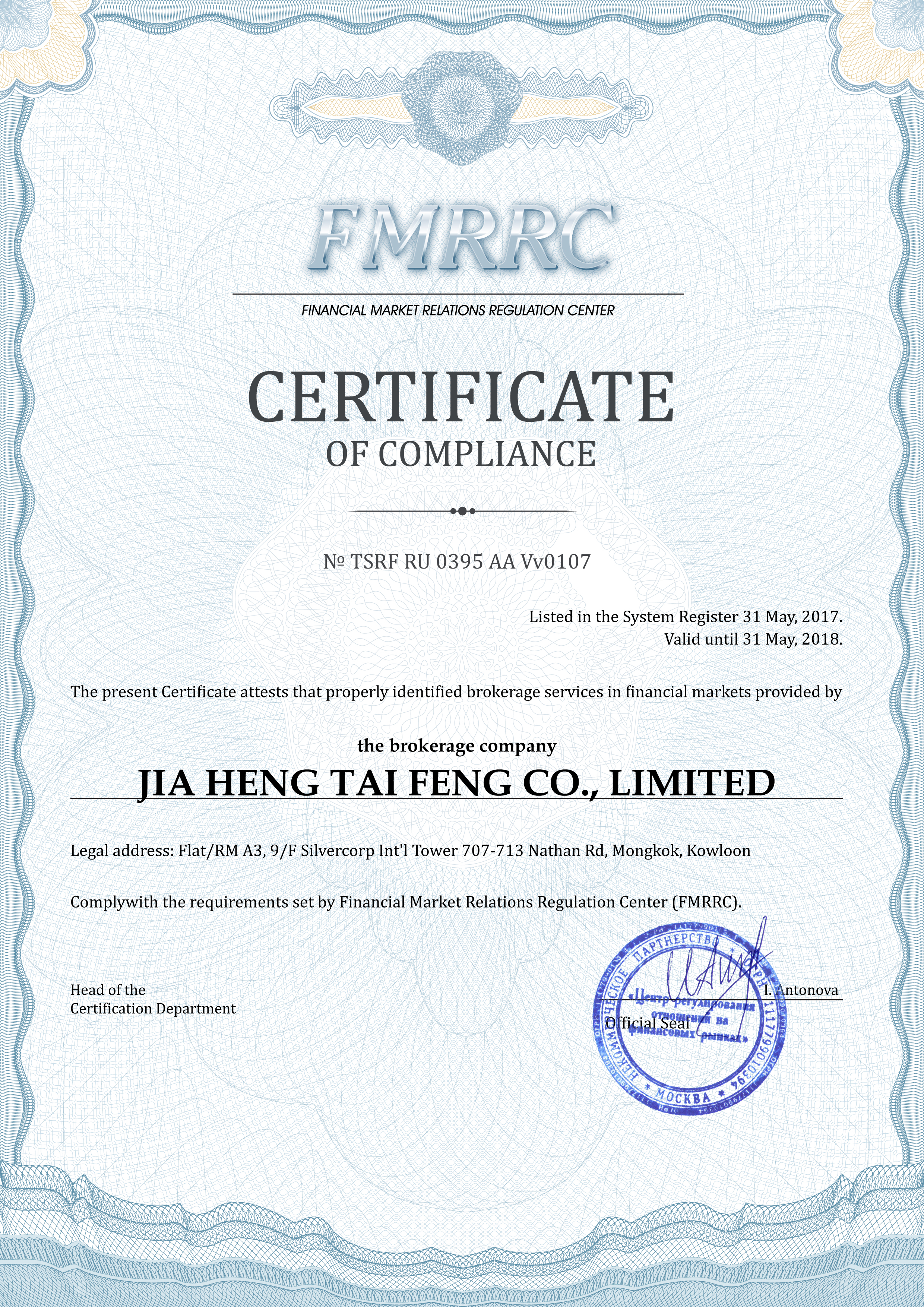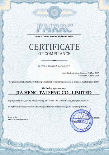 JIA HENG TAI FENG CO., LIMITED company Certificate of compliance
