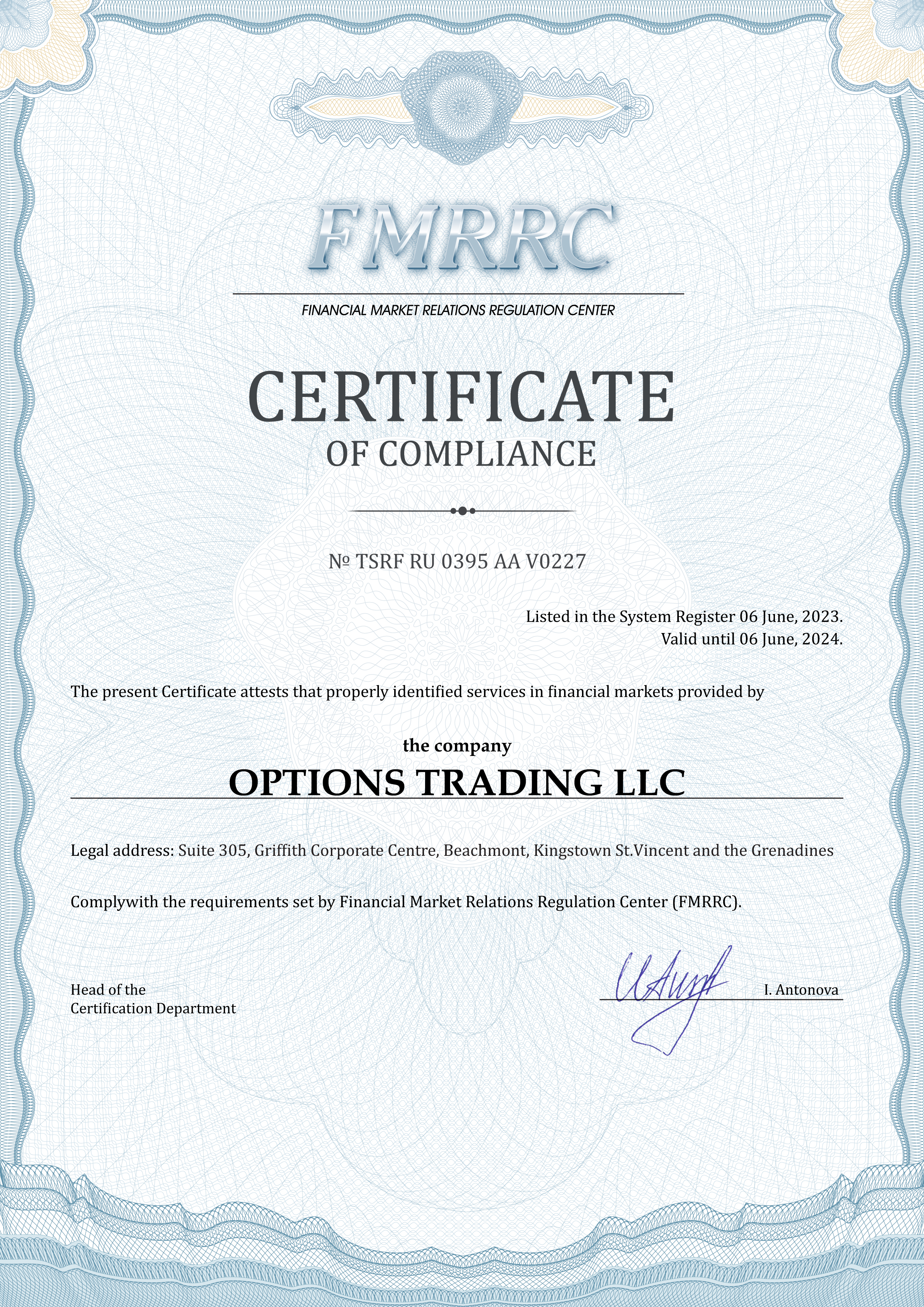 OPTIONS TRADING LLC company Certificate of compliance