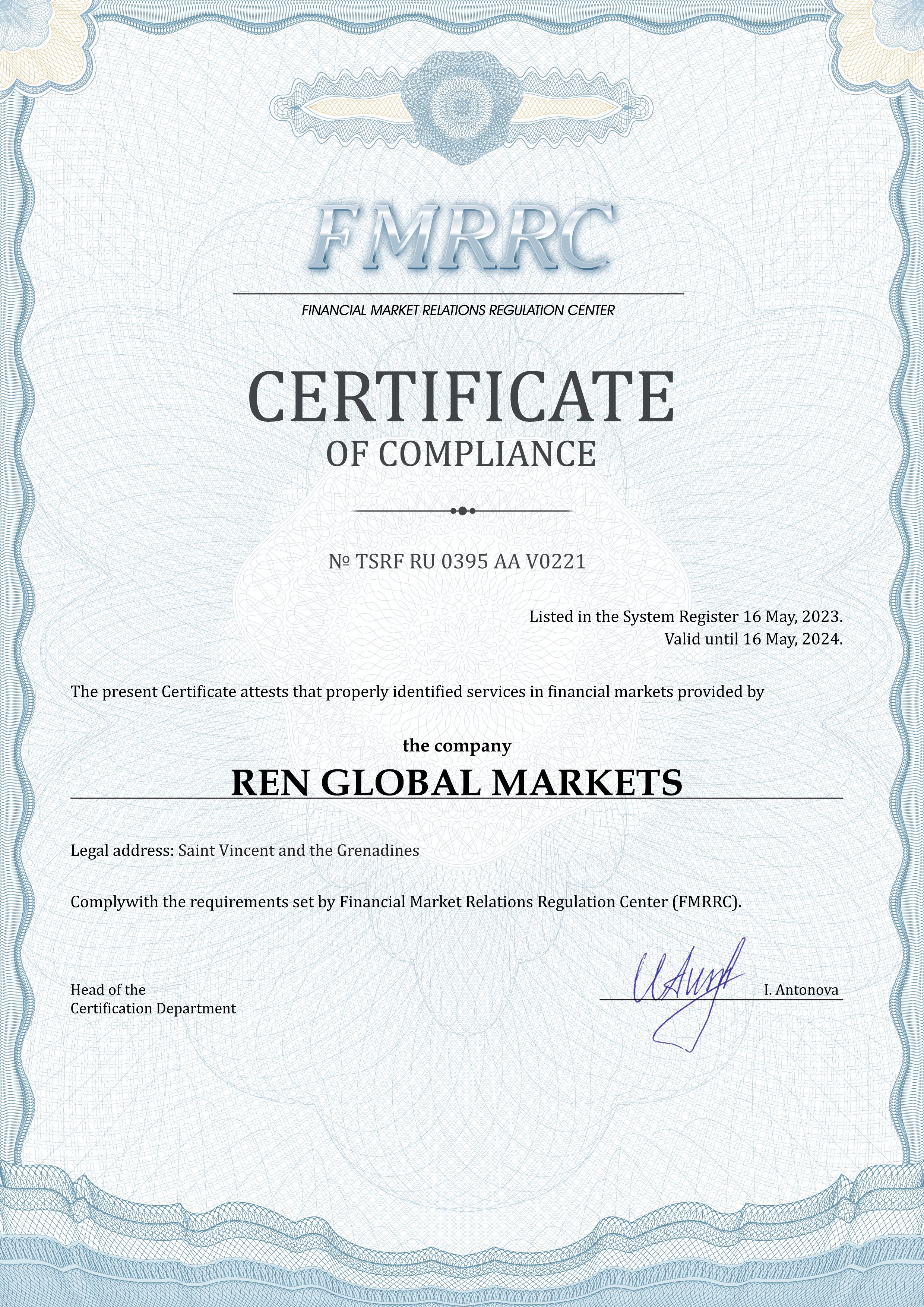 REN GLOBAL MARKETS company Certificate of compliance