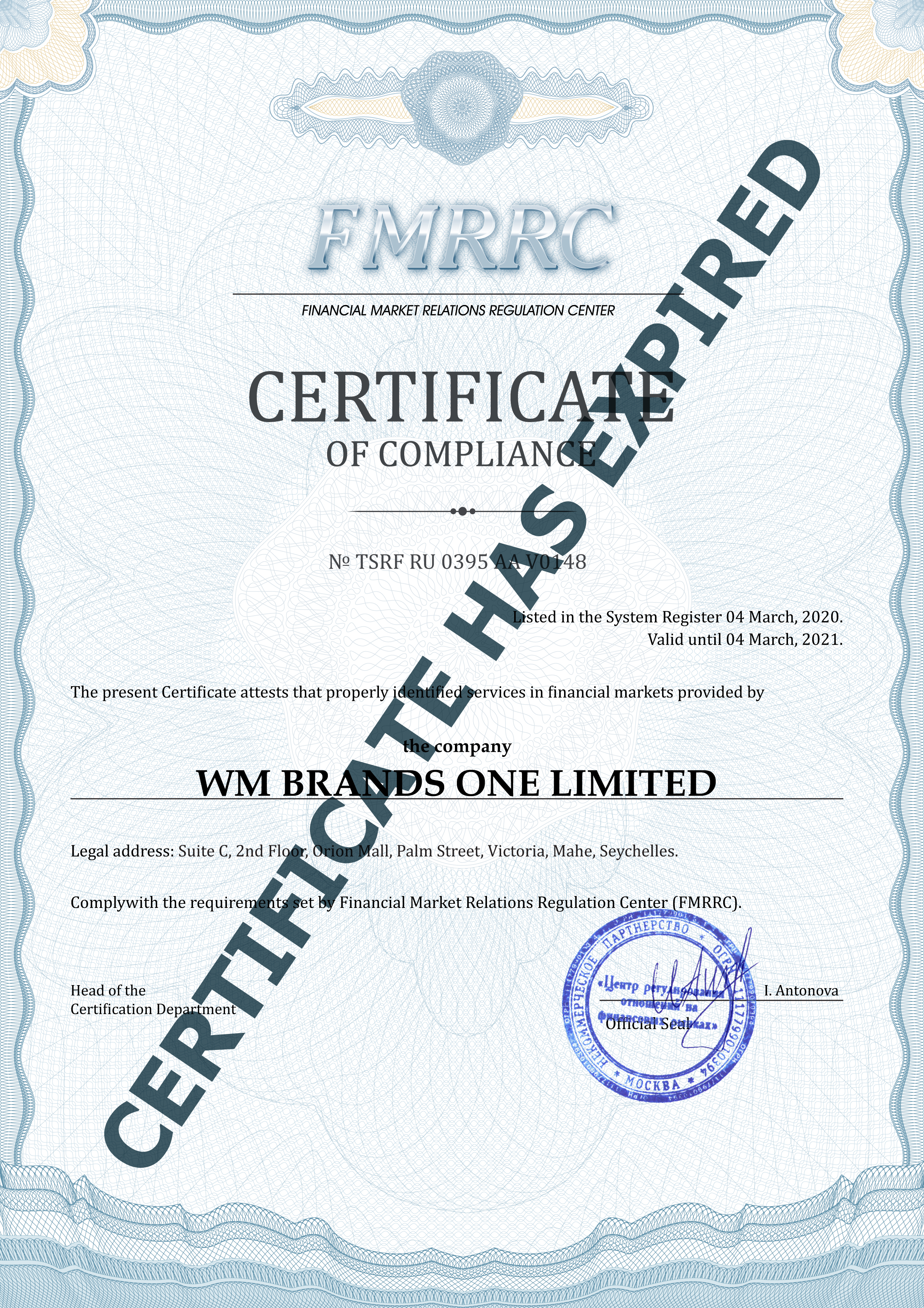 WM BRANDS ONE LIMITED company Certificate of compliance